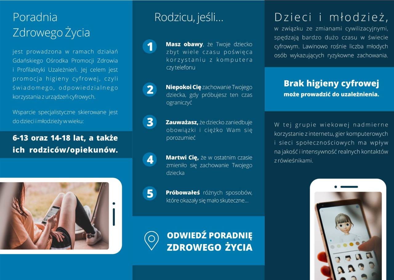 Poradnia Zdrowego Życia jest prowadzona w ramach działań Gdańskiego Ośrodka Promocji Zdrowia i Profilaktyki Uzależnień. Jej celem jest promocja higieny cyfrowej, czyli świadomego, odpowiedzialnego korzystania z urządzeń cyfrowych.